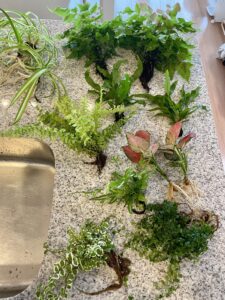 根っこを隠すように水苔を乗せて、その上に植物、と繰り返して植えていきます。